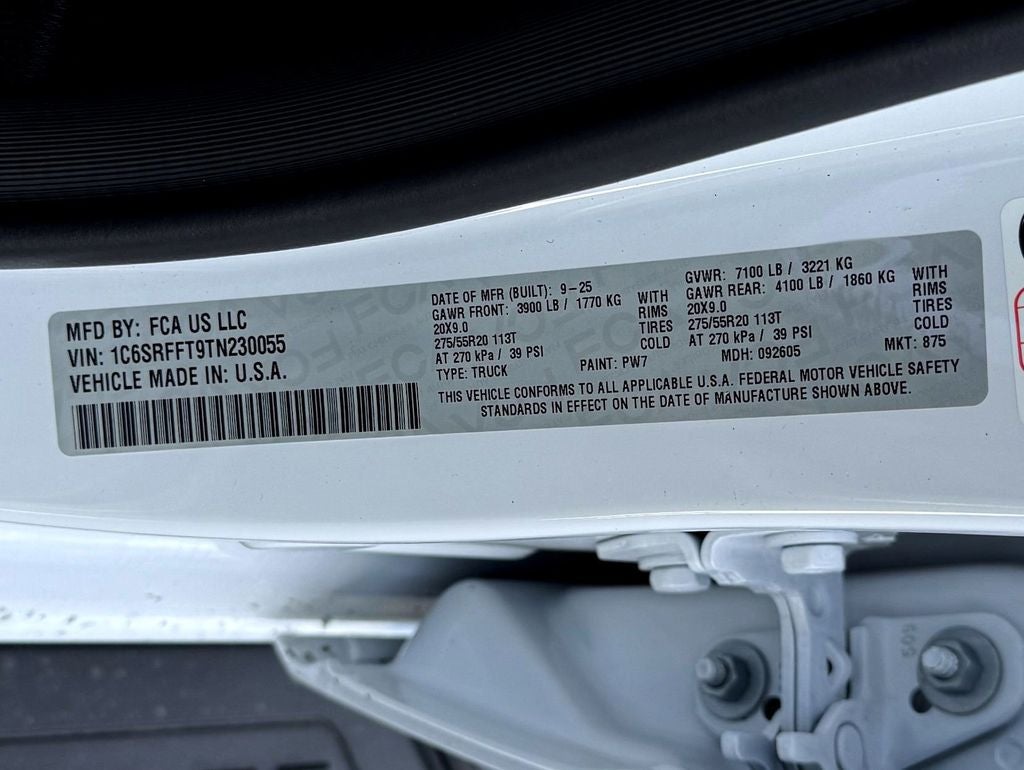 MOPAR FRONT & REAR RUBBER FLOOR MATS, MOPAR BLACK TUBULAR SIDE STEPS, ENGINE: 5.7L V8 HEMI MDS VVT ETORQUE -inc: Active Noise Control System, Heavy Duty Engine Cooling, Passive Tuned Mass Damper, GVWR: 7,100 lbs, Dual Rear Exhaust w/Bright Tips, Passive Cold End Exhaust, 18 Aluminum Spare Wheel, 33 Gallon Fuel Tank, DUAL-PANE PANORAMIC SUNROOF -inc: Dome Dual LED Reading Lamp, BRIGHT WHITE CLEARCOAT, BIG HORN LEVEL 2 EQUIPMENT GROUP -inc: SiriusXM Radio Service, Power Adjustable Pedals, Leather Wrapped Steering Wheel, 12 Touchscreen Display, Glove Box Lamp, Auto Power-Folding Mirrors, 115V Auxiliary Rear Power Outlet, Media Hub w/2 Charge Only USBs, Heated Front Seats, Security Alarm, Black Premium Power Mirrors, Premium Overhead Console, 9 Amplified Speakers w/Subwoofer, Disassociated Touchscreen Display, Secondary Active Grille Shutters, Wireless Charging Pad, Body Color Fender Flares, Remote Tailgate Release, 115V Auxiliary Power Outlet, LED Dome Lamp w/On/Off Switch, Universal Garage Door Opener, 2nd Row In Floor Storage Bins, Sun Visors w/Illuminated Vanity Mirrors, LED Footwell Lighting, Rear Window Defroster, Rear View Auto Dim Mirror, Rear Power Sliding Window, GPS Navigation, Overhead LED Lamps, Wheels: 20 x 9 Aluminum Chrome Clad (WRK), Tires: 275/55R20 OWL All Season, Bridgestone Brand Tires, Auto Dim Exterior Driver Mirror, SiriusXM w/360L, Connected Travel & Traffi, 3.92 REAR AXLE RATIO, Voice Recorder, Vinyl Door Trim Insert, Variable Intermittent Wipers.
