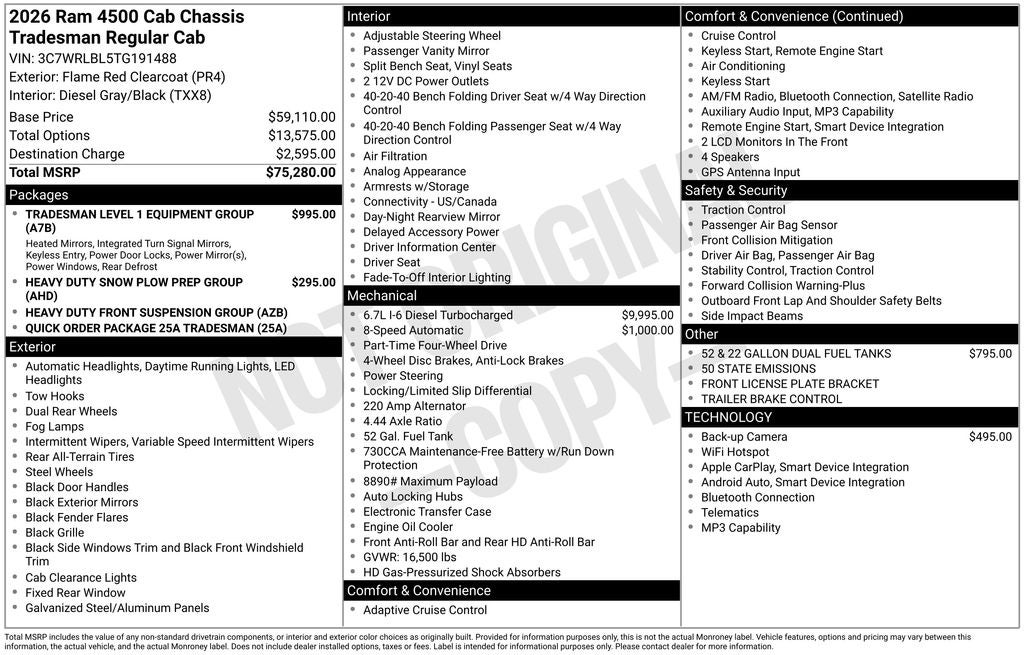 GVWR: 16,000 LBS, FLAME RED CLEARCOAT, ENGINE: 6.7L I6 CUMMINS TURBO DIESEL -inc: Selective Catalytic Reduction (Urea), Dual 730 Amp Maintenance Free Batteries, Clean Idle Emissions Label, Cummins Turbo Diesel Badge, Current Generation Engine Controller, Smart Diesel Exhaust Brake, Supplemental Heater, B-20 Bio Diesel Capability, 52 & 22 GALLON DUAL FUEL TANKS, Wheels: 19.5 x 6.0 Black Painted Steel, Wheels w/Hub Covers, Voice Recorder, Variable Intermittent Wipers, Urethane Gear Shifter Material, Upfitter Switches.
