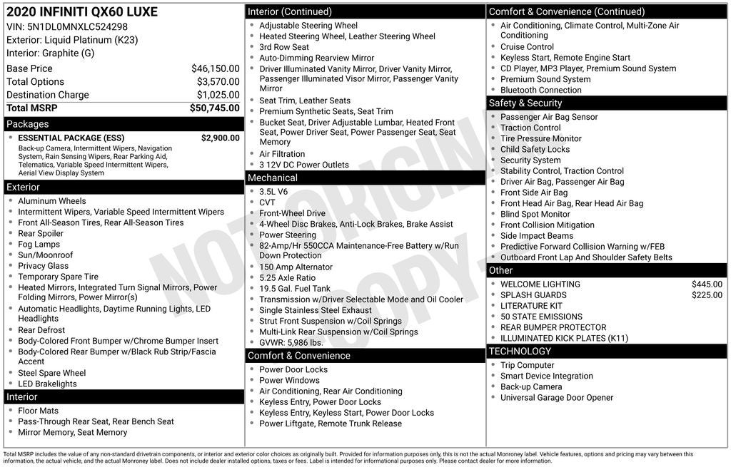 Whether you're embarking on a family road trip or tackling your daily commute, the 2020 INFINITI QX60 LUXE is the perfect companion. Its versatile seating configuration and generous cargo space ensure that you can accommodate all your needs with ease.